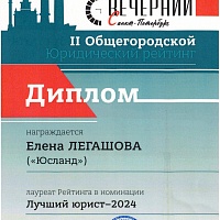 On June 20, 2024, lawyers were awarded based on the results of the II Citywide Legal Rating of the newspaper “Evening St. Petersburg”. Elena Legashova took second place in the ranking in the “Best Lawyer” nomination, which once again confirmed her right to be called one of the best lawyers in our city. In addition to the opinion of the rating jury, the selection of the best was carried out based on the results of voting among the lawyers taking part in the rating.